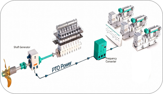 The SG is driven by the main engine's power to generate electricity, supplying electric power to the whole ship, and replacing or reducing the use of diesel generators.