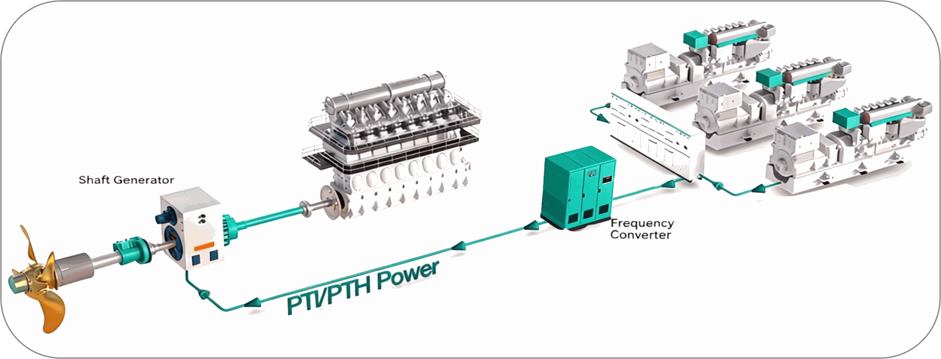 The marine shaft generator system is an energy-saving system that reuses the excess power from the main engine for electricity generation - While the ship is in stable navigation, redundant output power from the main engine is converted into electric power through the shaft generator, supplying electric power to the whole ship.